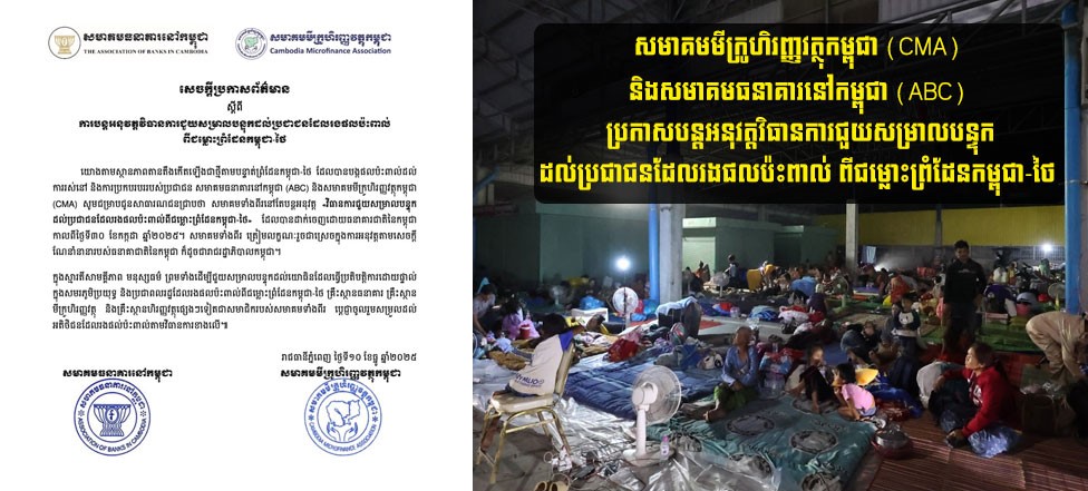 សមាគមមីក្រូហិរញ្ញវត្ថុកម្ពុជា (CMA) និងសមាគមធនាគារនៅកម្ពុជា (ABC) ប្រកាសបន្តអនុវត្តវិធានការជួយសម្រាលបន្ទុកដល់ប្រជាជនដែលរងផលប៉ះពាល់ ពីជម្លោះព្រំដែនកម្ពុជា-ថៃ